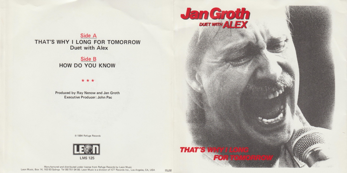 That’s Why I Long for Tomorrow – b/w “How Do You Know” – is a two-sided 7-inch vinyl single by the Norwegian singer and songwriter Jan Groth, the title track being a duet with Alex, released in 1984, manufactured and distributed by Leon Music under license from Refuge Records (catalogue number LMS 125). (“Leon Music is a division of ICT Records Inc., Los Angeles, CA, USA.”) Both tracks were taken from Groth’s full-length album Roots released on Refuge Records the same year, distributed by The Benson Company in the US. The album was recorded by Steve Forward at Redan Recorders in London, England; with Jan Groth and Ray Nenow producing. Mixed by Johnny Shines at Redan Recorders. Arranged by Groth “with good help from all the musicians on the album.” Both songs written by Jan Groth.