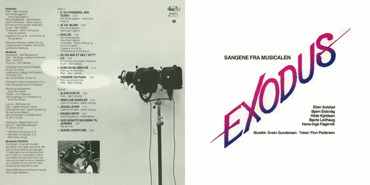 Exodus is a musical written by the Norwegian songwriters Svein Gundersen (music) and Finn Pedersen (lyrics) (the latter of Good News fame), released on the Norwegian gospel label Storm Production in 1984, distributed by Master Music. The album was recorded by Fred and Svein Dalbakk at Studio 19 in Hamar, Norway; with Finn Pedersen and Svein Gundersen producing. Mixed by Fred Dalbakk at Studio 19. Additional recording by Rolf Løvland at FA-Studio in Oslo, Norway. Arranged by Gundersen.