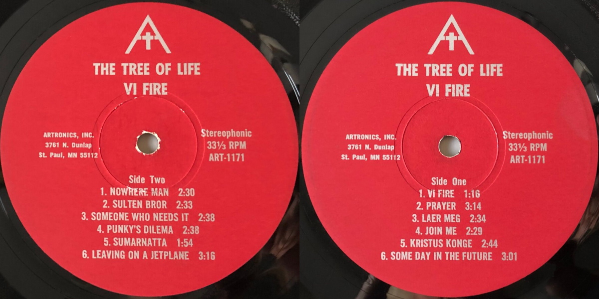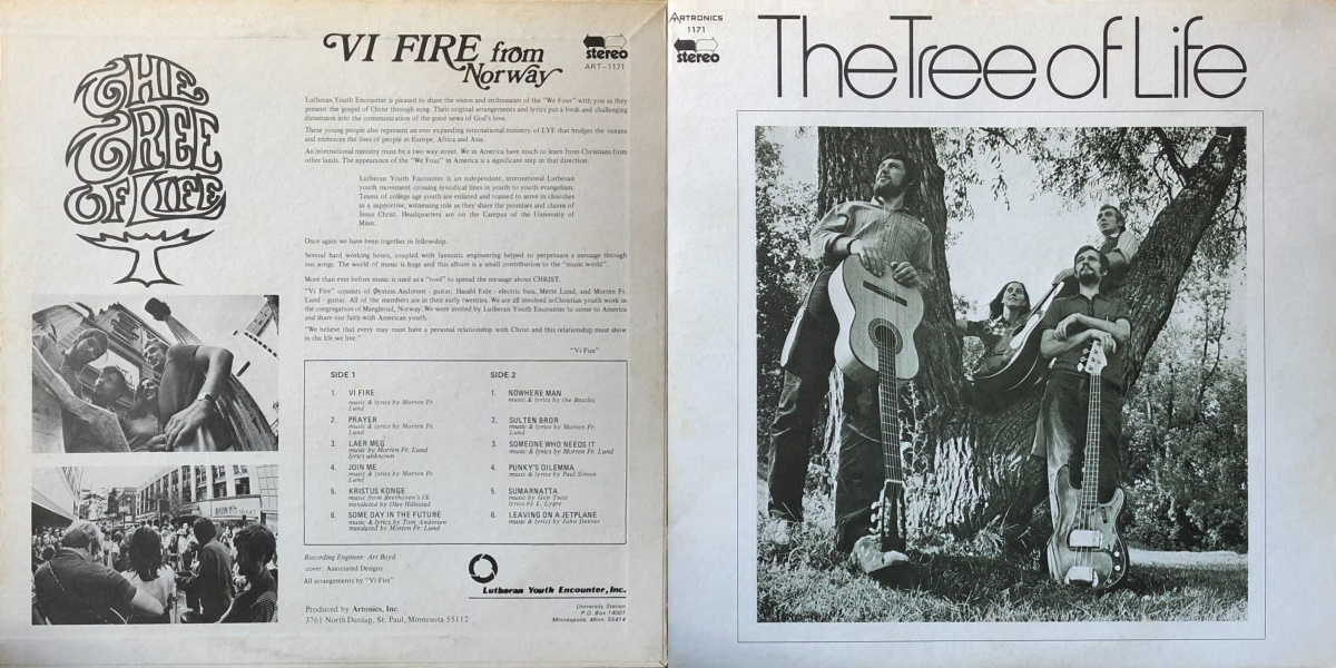 The Tree of Life is an album by Norwegian folk quartet Vi Fire (“The Four of Us”), independently released in the US on Artronics in 1971. The album was engineered by Art Boyd. Produced by Artronics, Inc. Arranged by the group. All songs written by group member Morten Fr. Lund except track A5 featuring music by Beethoven with lyrics translated to Norwegian by Olav Hillestad, track A6 featuring music and lyrics by Tom Andersen (translated by Lund), as well as track B1 (the Beatles classic “Nowhere Man”), track B4 (Paul Simon’s “Punky’s Dilemma”), track B6 (John Denver’s “Leaving On A Jetplane”), and track B5 («Vi skal ikkje sova bort sumarnatta» is a well-known Norwegian ballad featuring lyrics by Aslaug Låstad Lygre and music by composer Geirr Tveitt).