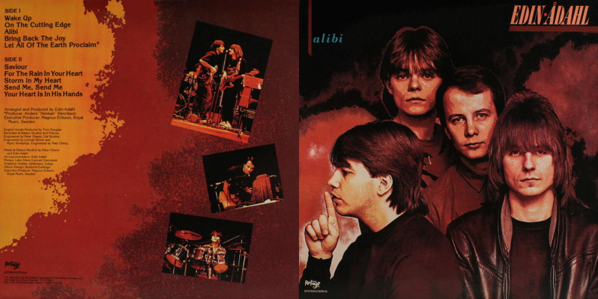 Alibi is the sophomore album by Swedish pop/rock band Edin-Ådahl, released in the US on Refuge Records in 1983, distributed by The Benson Company. (The original Swedish version of the album was released in Sweden on CBS Records the previous year. The English version substitutes the Swedish track “Idag” with a brand new song, “For The Rain In Your Heart”.) The album was recorded by Peter Olsson at Studio Bastun and Polyvox in Stockholm, by Lennart Ström at OAL Studio in Sollentuna, and by Mats Öberg at Music Workshop in Stockholm, Sweden; with the band producing and arranging for Royal Music Production (except track B4 produced by Anders “Henkan” Henriksson). Mixed by “Paris” at Polar Studios in Stockholm. (English vocals produced by Tom Douglas. Mixed at Bastun Studios by Peter Olsson and the band.)