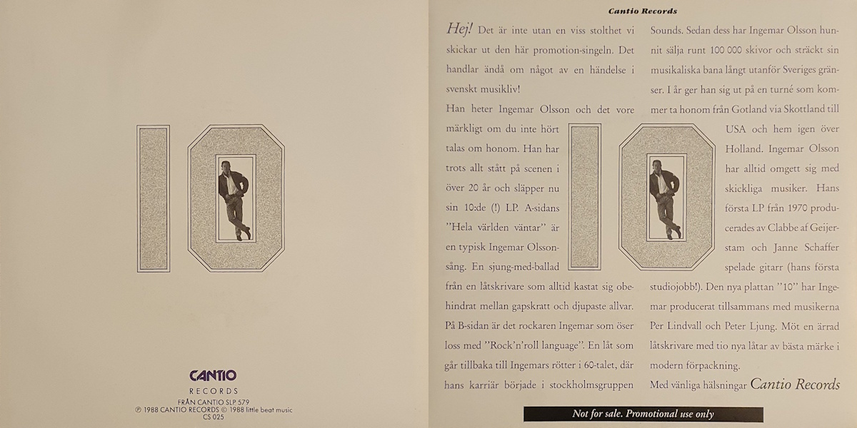 “Hela världen väntar” – b/w “Rock’n’roll Language” – is a two-sided 7-inch vinyl single by the Swedish singer and songwriter Ingemar Olsson, released on the Swedish gospel label Cantio Records in 1988 (catalogue number CS 025). Both tracks taken from his full-length album 10, released on Cantio Records the same year, recorded by Conny Ebegård at Polar Studios in Stockholm, Sweden; with Ingemar Olsson producing. Both track written by Ingemar Olsson.