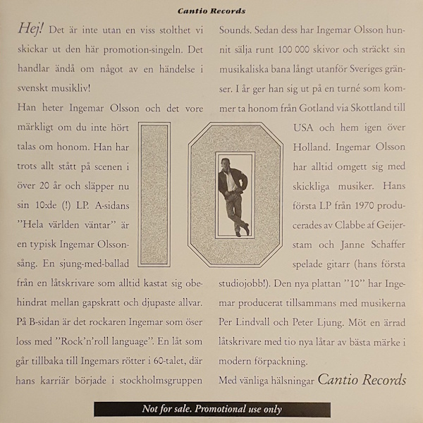 Han heter Ingemar Olsson och det vore märkligt om du inte hört talas om honom. Han har trots allt stått på scenen i över 20 år och släpper nu sin 10:de (!) LP. A-sidans “Hele världen väntar” är en typisk Ingemar Olsson-sång. En sjung-med-ballad från en låtskrivare som alltid kastat sig obehindrat mellan gapskratt och djupaste allvar. På B-sidan är det rockaren Ingemar som öser loss med “Rock’n’roll language”. En låt som går tillbaka til Ingemars rötter i 60-talet, där hans karriär började i stockholmsgruppen Sounds. Sedan dess har Ingemar Olsson hunnit sälja runt 100 000 skivor och sträckt sin musikaliska bana långt utanför Sveriges gränser. I år ger han sig ut på en turné som kommer ta honom från Gotland via Skottland till USA och hem igjen över Holland. Ingemar Olsson har alltid omgett sig med skickliga musiker. Hans första LP från 1970 producerades av Clabbe af Geijerstam och Janne Schaffer spelade gitarr (hans första studiojobb!). Den nya plattan “10” har Ingemar producerat tillsammans med musikerna Per Lindvall och Peter Ljung. Möt en ärrad låtskrivare med tio nya låtar av bästa märke i modern förpackning.