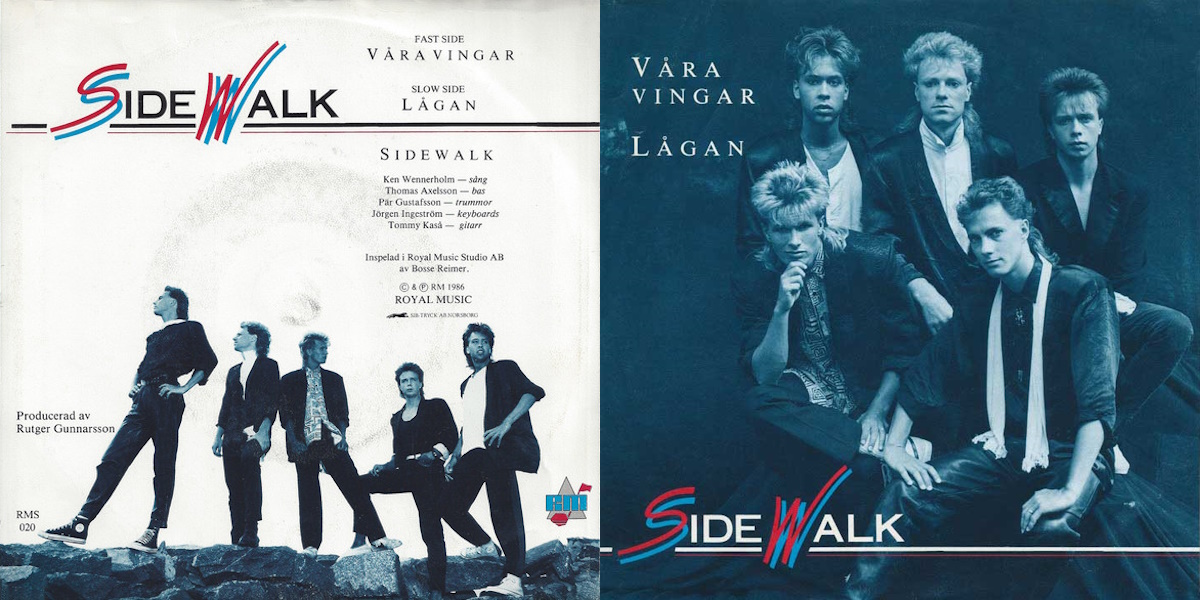 “Våra vingar” – b/w “Lågan” – is a two-sided 7-inch vinyl single by the Swedish pop/rock band Sidewalk, released on the Swedish gospel label Royal Music in August 1986 (catalogue number RMS 020). Both tracks were taken from the band’s up-coming full-length album Tiden är här released on Royal Music the next year, recorded by Bosse Reimer and Benny Lundin at Royal Music Studio in Mölndal, Sweden; with ABBA-sideman Rutger Gunnarsson producing. The track on the A-side was co-written by Jörgen Ingestöm (music) and Ken Wennerholm (lyrics), with the track on the flip-side written by Tommy Kaså.