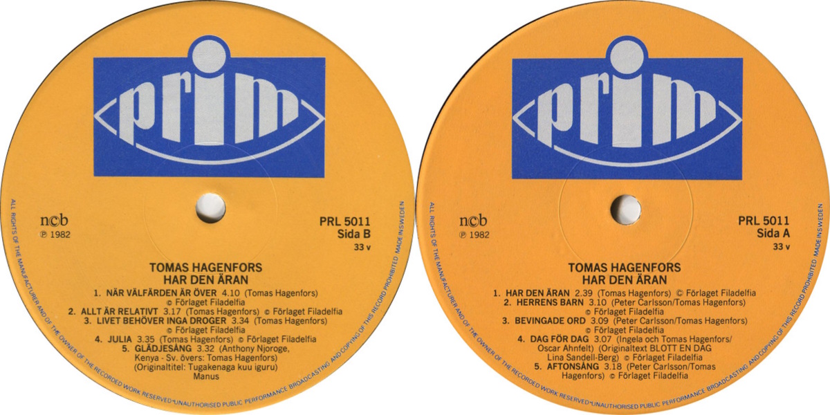 Tomas Hagenfors - Har den äran! (Prim 1982) LP labels, Side2 and Side1