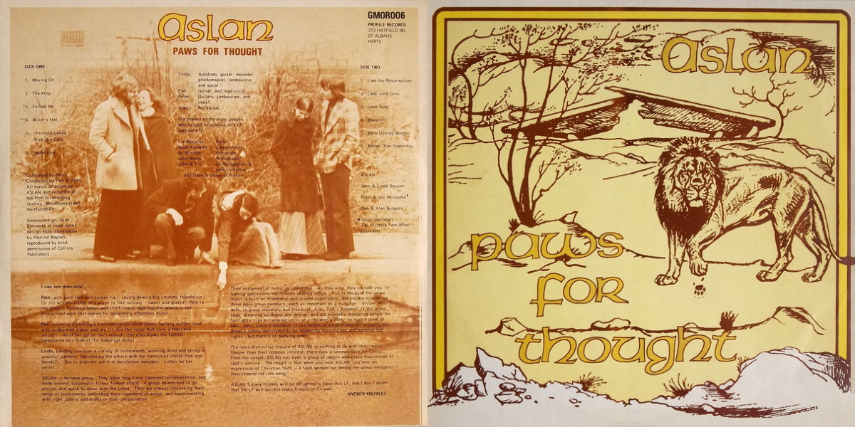 Not to be confused with some American groups of the same name, this is a very obscure UK album of simple unpretentious progressive British folk. This particular Aslan hails from Leicestershire, England and consists of three girls and three guys. Their fragile vocals, acoustic guitars, autoharp, flute, recorder, glockenspiel and percussion all work together to create a sincere beauty and charm. The music sometimes reflects the style of old-time traditional English folk, even on their self-composed songs. They are also in some ways reminiscent of Parchment’s best moments, minus the electric components, resulting in a warm acoustic sound. Good renditions of titles by Graham Kendrick («Moving On», «Sweet Fire») and Parchment («Better Than Yesterday»). «Beauty» is a poem of the beauty of God and His creation recited over acoustic guitar. Other covers include «University Song (Kick The Cat)», «Love Song» (the one popularized by Elton John), the traditional «The King» (which has also been covered by Steeleye Span) and «I Am The Resurrection». Also some excellent originals, including «Follow Me», «Lady Jane Grey» and the playful «Witch’s Hat» (nice tandem harmonies). A very pricey item now on a highly collected label. [Ken Scott, The Archivist, 4th edition]