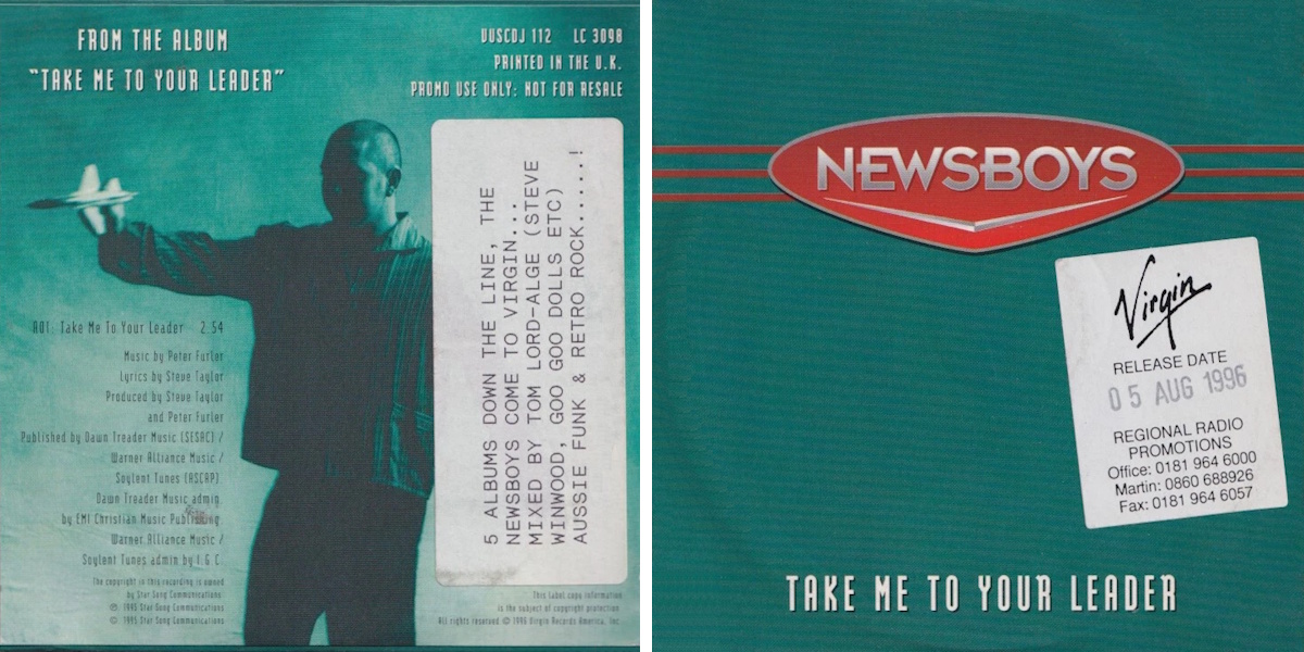 Take Me to Your Leader is a CD-single by the Australian established but US based pop/rock band Newsboys, released in the UK on Virgin Records/Warner Alliance Music in August 1996 (catalogue number VUSCDJ 112). The track was taken from the band’s full length album Take Me to Your Leader released in the US on Star Song Records the same year, an album recorded at The Sanctuary and The Carport in Nashville, Tennessee; at Eldorado Recording Studio in Hollywood, California; at Steve’s Studio in Stillwater, Oklahoma; and at Walls Have Ears in Milwaukee, Wisconsin; with Steve Taylor and band member Peter Furler producing. Music written by band member Peter Furler with lyrics written by Steve Taylor. “Aussie Funk & Retro Rock…”