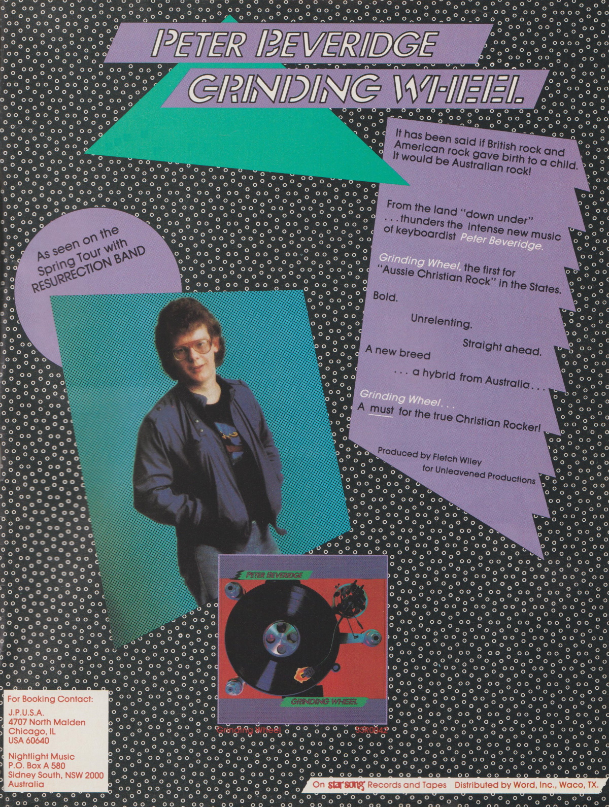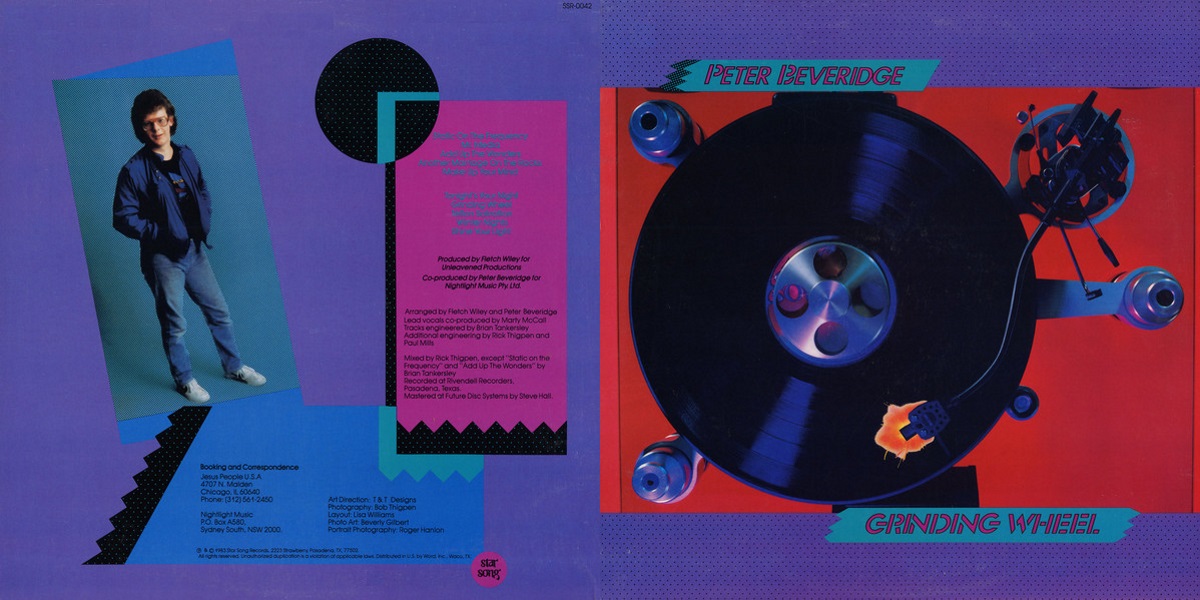 With Australian groups like Men At Work consistently topping the charts, it seems reasonable that Star Song Records should showcase a Christian talent from “down under”. Peter Beveridge’s ‘Grinding Wheel’ proves that there’s more than kangaroos hoppin’ on the island continent.