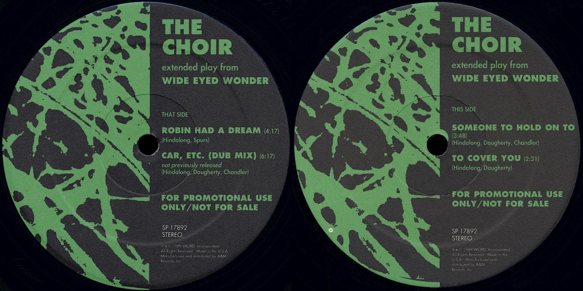 Extended Play from Wide Eyed Wonder is a four-track 12-inch vinyl EP/Maxi-single by the American alternative rock band The Choir, released on Word in 1989, manufactured and distributed by A&M Records (catalogue number SP 17892). Featuring four tracks – “Someone To Hold On To”, “To Cover You”, “Robin Had A Dream”, and “Car, Etc.” (Dub Mix, previously unreleased) – taken from the band’s full-length album Wide-Eyed Wonder released on Myrrh/A&M the same year, recorded in 1988 by Dave Hackbarth at Neverland Studios in Los Alamitos, California; with band members Derri Daugherty and Steve Hindalong producing. “Someone To Hold On To” and “Car, Etc.” co-written by Steve Hindalong, Derri Daugherty, and Tim Chandler, “To Cover You” co-written by Hindalong and Daugherty, and “Robin Had A Dream” co-written by Hindalong and Robin Spurs.