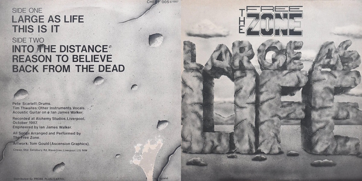 Large as Life is a five-track 45 RPM 12-inch EP, and the third effort, by the British synth pop/new wave band The Free Zone, independently released in the UK on Cheep Records in 1987. The tracks were recorded October 1987 by Ian James Walker at Alchemy Studios in Liverpool, England, and was arranged and performed by The Free Zone. All songs written by Tim Thwaites except track B3 co-written by Thwaites and Pete Scarlett.