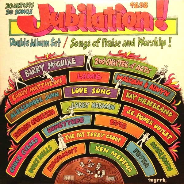 ‘Jubilation!’ is a very noteworthy aggregation of Jesus music. Choosing from such a wide assortment of contemporary Christian music has finally enabled a valuable collector’s edition. The reasonable priced two-record set gives Jesus music lovers a random sampling of artists. Larry Norman followers find a preview cut off is upcoming album, ‘In Another Land‘. Honeytree fans may notice that some barbaric producer has mechanically slowed down her great song, «Heaven’s Gonna Be A Blast». The English band, Parchment, makes their appearance along with Myrrh’s recently signed Pat Terry Group. Also included are Barry McGuire, Lamb, Sonlight Orchestra, Randy Matthews, Petra, Walt Mills, Ron Salisbury and the J.C. Power Outlet, Evie, 2nd Chapter of Acts, Ray Hildebrand, Aleksander John, Love Song, Malcolm and Alwyn, Ken Medema, Chuck Girard, and Marijohn.