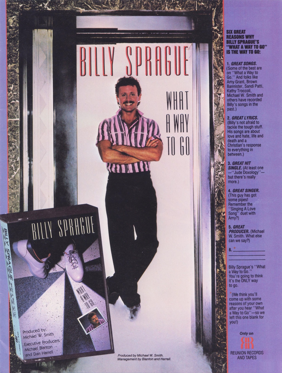 A full-page advertisement for Billy Sprague’s What A Way To Go was featured in the January 1985 issue of CCM Magazine.A full-page advertisement for Billy Sprague’s What A Way To Go was featured in the January 1985 issue of CCM Magazine.