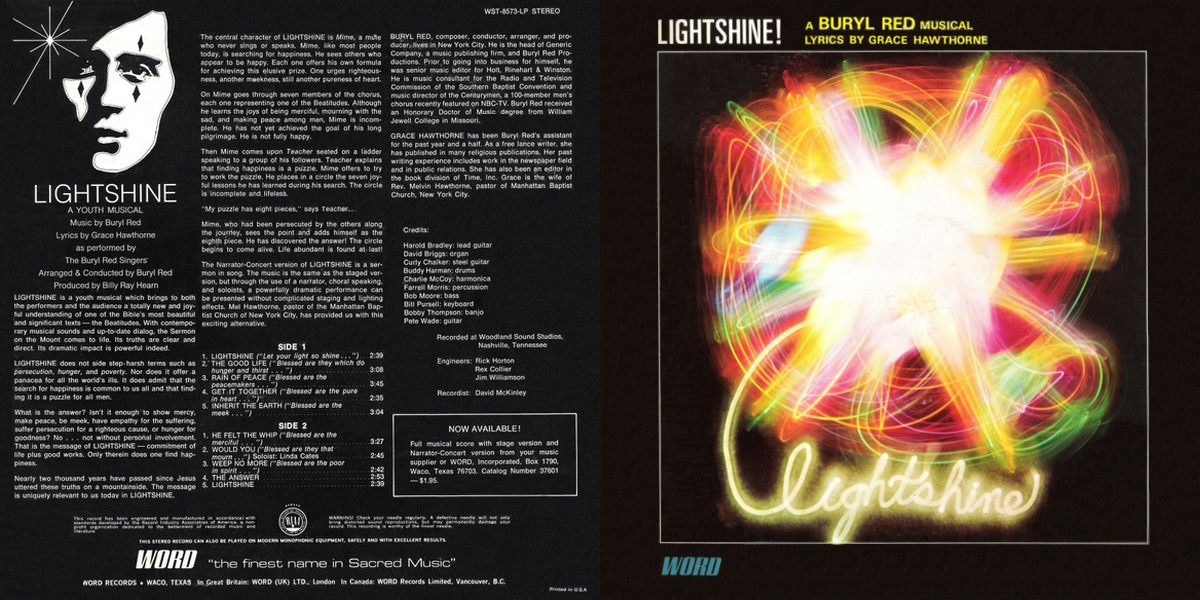 Lightshine! is “a youth musical” written and conceived by the American composer Buryl Red and lyricist Grace Hawthorne as performed by The Buryl Red Singers, released on Word Records in 1972. Also released in Europe by Word UK. The album was recorded by Rick Horton, Rex Collier, and Jim Williamson at Woodland Sound Studios in Nashville, Tennessee; with Billy Ray Hearn producing. Arranged and conducted by Buryl Red.