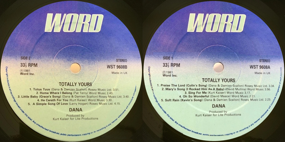 Having scored an Irish No. 1 in January 1980 with the song that was based on the Pope’s motto: “Totus Tuus” (Latin for Totally Yours), the much larger American Christian market became a possible outlet for her music. Not long after returning home from a promotional visit to the National Religious Broadcasters conference in Washington, opened by US President Jimmy Carter, she was contacted by award-winning songwriter Kurt Kaiser, vice president of Word Records. He invited her back to the USA where she was offered a recording contract. Meanwhile, Warwick Records issued Everything is Beautiful in late 1980. Recorded in September at Pye Studios in London, the LP subtitled 20 Inspirational Songs was advertised on TV and became her biggest-selling album in the UK, reaching No. 43 in the chart on 10 January 1981. It was followed later that year by Totally Yours, her first Christian album for Word Records; the songs “Praise the Lord”, “The Soft Rain” and “Totus Tuus” were credited to “Dana and Damien Scallon”. As was “Little Baby (Grace’s Song)”, written while she was pregnant with their first child.