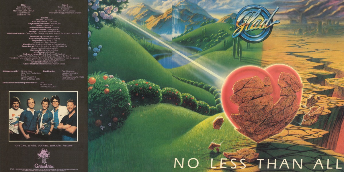 No Less Than All is the fourth studio album by the American vocal pop group Glad, released on Greentree Records in 1983, distributed by The Benson Company. The album was recorded by Joe Hardy and John Hampton at Ardent Recording Studios in Memphis, Tennessee; and by Billy Brady at Omega Studios in Kensington, Maryland; and was produced by band member Ed Nalle with Glad. Mixed by Brady and Nalle at Omega Studios.
