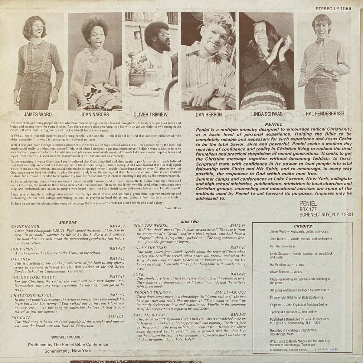 Piano man James Ward’s music would eventually evolve into an entertaining poprock style somewhere between Keith Green and Billy Joel, drawing on such influences as gospel, soul, r&b, boogie, vaudeville, barrel house, you name it. His debut album, however, kicks off on a very strong black gospel note, Ward sharing the vocal spotlight with black singers Joan Nabors and Oliver Trimiew. The music ranges from gentle ballads with a wistful air to hand-clapping pewshakers. Published and distributed by Peniel, a Schenectady, New York ministry “designed to encourage radical Christianity at a basic level of personal experience”. Scarcely recognizable with his long hair and overalls. [Ken Scott, The Archivist, 4th Edition]
