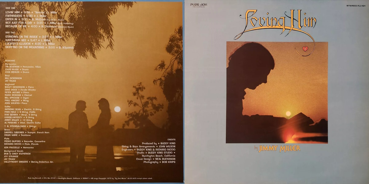 Loving Him is an album by the American singer and songwriter Jimmy Miller, independently released on Pure Joy Records in 1975. Also released by DaySpring Records, a division of Word. The album was recorded by Richard Riccio and Buddy King at Buddy King Studios in Huntington Beach, California; with King producing. String and brass arrangements by John Wilson. All songs written by Jimmy Miller except track A3 written by Barry McGuire (his tribute to C. T. Studd), track B5 written by B. Dickerson, and track B5 written by Bob Kilpatrick (with track A1 featuring lyrics by Ms. Nerissa Broad).