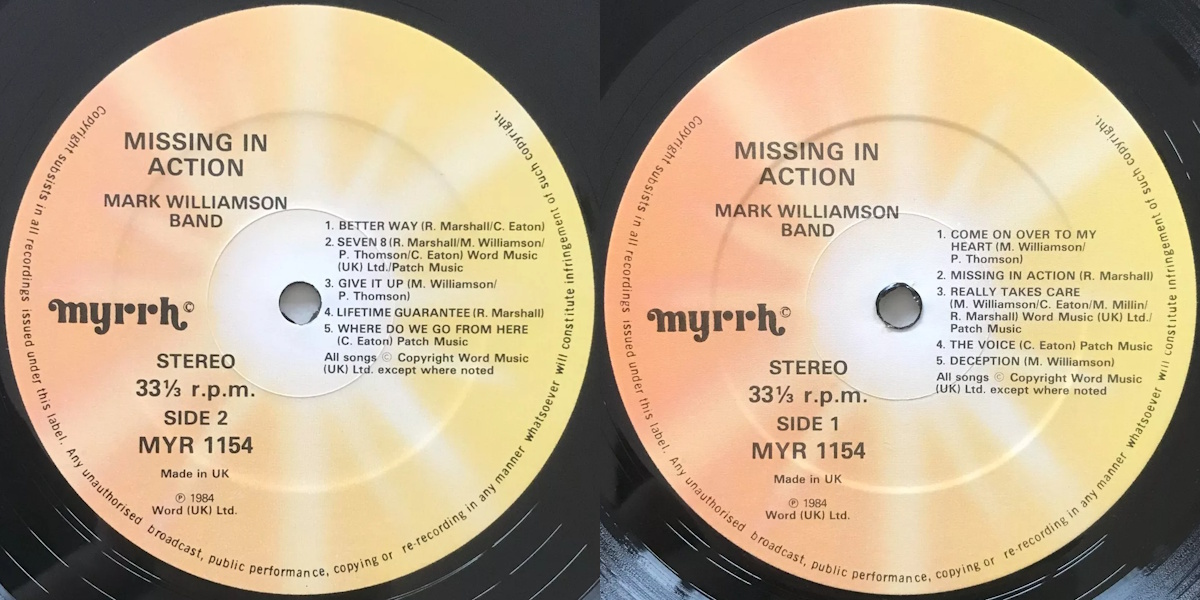 Missing in Action is the sophomore and final album by the British pop-rock outfit Mark Williamson Band, released on Myrrh Records in 1984, a division of Word. The album was recorded and mixed during August 1983 by Chas Watkins at Cloud 9 in Surrey, England; with Francis Usmar producing. This release is least new-wave, more R&B blue-eyed soul, with some of the Police mixed in. The Chris Eaton-penned “Where Do We Go From Here” previously had been recorded by Cliff Richard on his 1982-album Now You See Me…Now You Don’t.