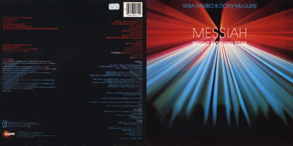 Messiah, Bright Morning Star is a musical written by the American singer-songwriter duo Reba Rambo & Dony McGuire, released on Light Records in 1982. Also manufactured and distributed by Elektra/Asylum Records, a division of Warner Communications. (“This is the music of Christmas… of Good Friday… of Easter… of that great day when we shall be together with Him… this is the music of the Messiah, our Bright Morning Star.”) Album tracks and vocals were recorded by Warren Petterson at Mama Jo’s Recording Studio in North Hollywood, California; with Dony McGuire and Bill Cole producing for Productions of McGuire. Overdubs engineered by Win Kutz assisted by Steve Ford. Orchestrations recorded by Bob Clark at Benson Studio. Mixed at Mama Jo’s. Arranged by Dony McGuire (rhythm, vocals) and Buddy Skipper (orchestrations). All songs written by Reba Rambo/Dony McGuire except track A4 written by McGuire/Bill Gaither, B2 written by McGuire/Judy Gossett, B3 and B4 written by Rambo/McGuire/Gossett, and track B5 written by Rambo/McGuire/Bill & Gloria Gaither.