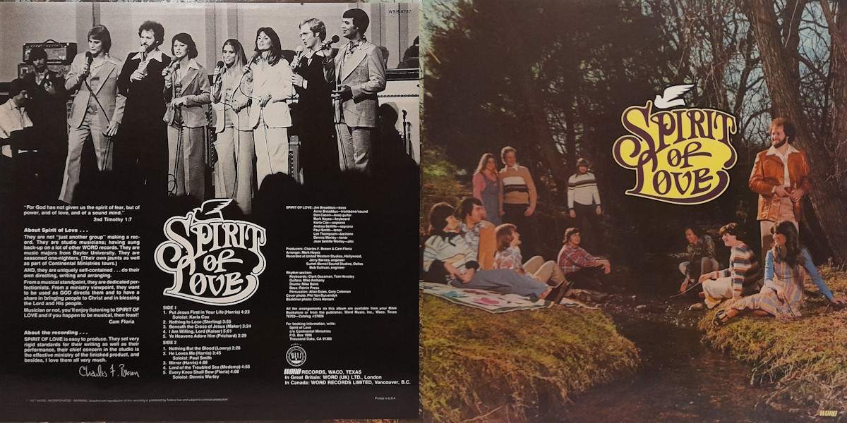 The self-titled album by the American pop combo Spirit of Love was released on Word Records in 1977. The album was recorded by Jerry Barnes at United Western Studios in Hollywood, California; and by Bob Sullivan at Sumet-Bernet Sound Studios in Dallas, Texas; with Charles F. Brown and Cam Floria producing. Arranged by band member Mark Hayes.