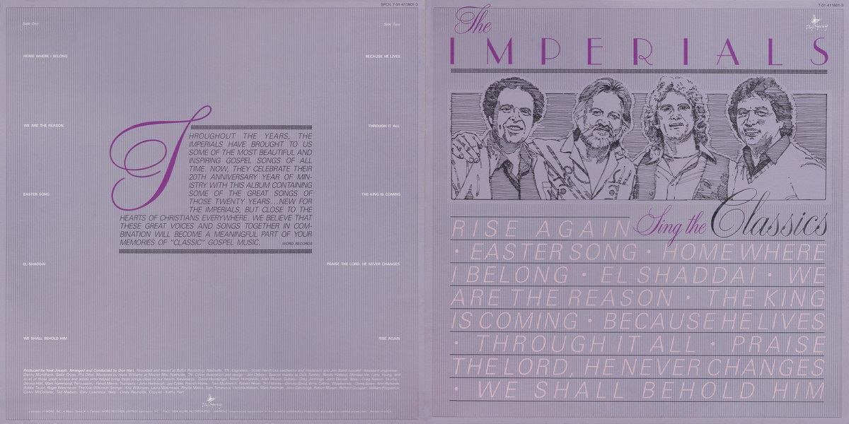 The Imperials sing the Classics is an album by the American pop quartet The Imperials, released on DaySpring Records in 1984, a division of Word. The album was recorded and mixed by Scott Hendricks at Bullet Recording in Nashville, Tennessee; with Neal Joseph producing. According to CCM Magazine, The Imperials Sing the Classics was the 10th best selling album of 1984 in the Christian music market.