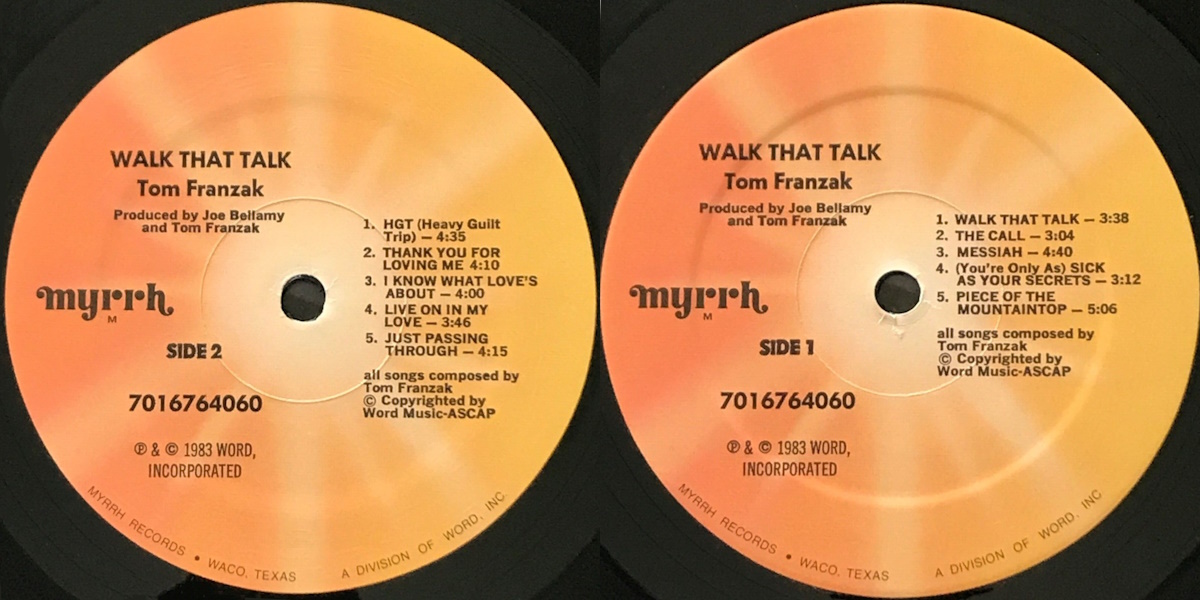 The same year Myrrh Records released a four-track 7-inch split EP featuring two tracks from Walk That Talk (“I Know What Love’s About” and “Walk That Talk”) as well as two tracks from Randy Stonehill’s 1983 Myrrh release Equator (“Shot De Do” and “Light of the World”).