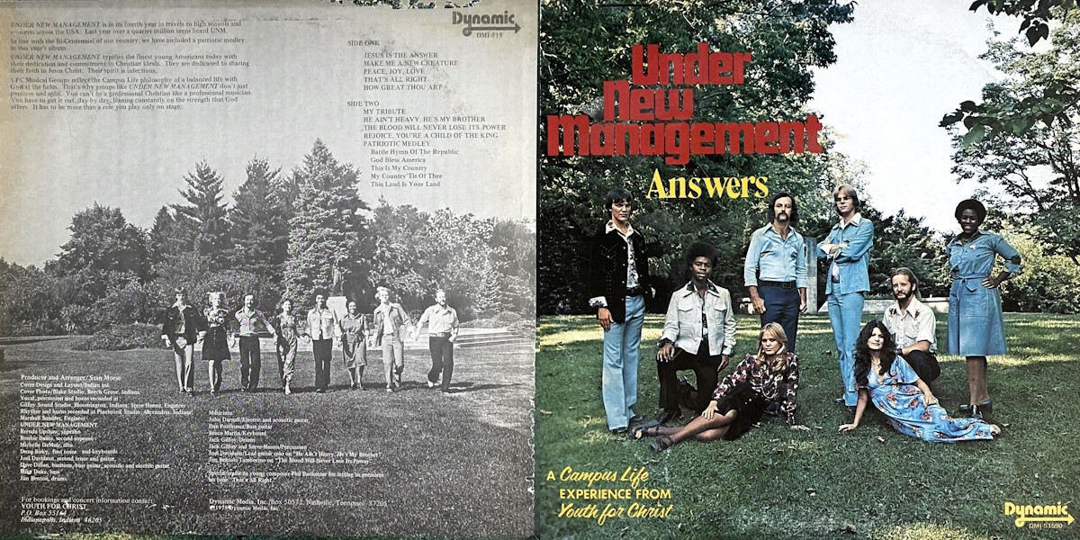 YFC Musical Groups reflect the Campus Life philosophy of a balanced life with God at the helm. That’s why groups like UNDER NEW MANAGEMENT don’t just perform and split. You can’t be a professional Christian like a professional musician. You have to gut it out, day by day, leaning constantly on the strength that God offers. It has to be more than a role you play only on stage. [Note on the back of the LP sleeve]