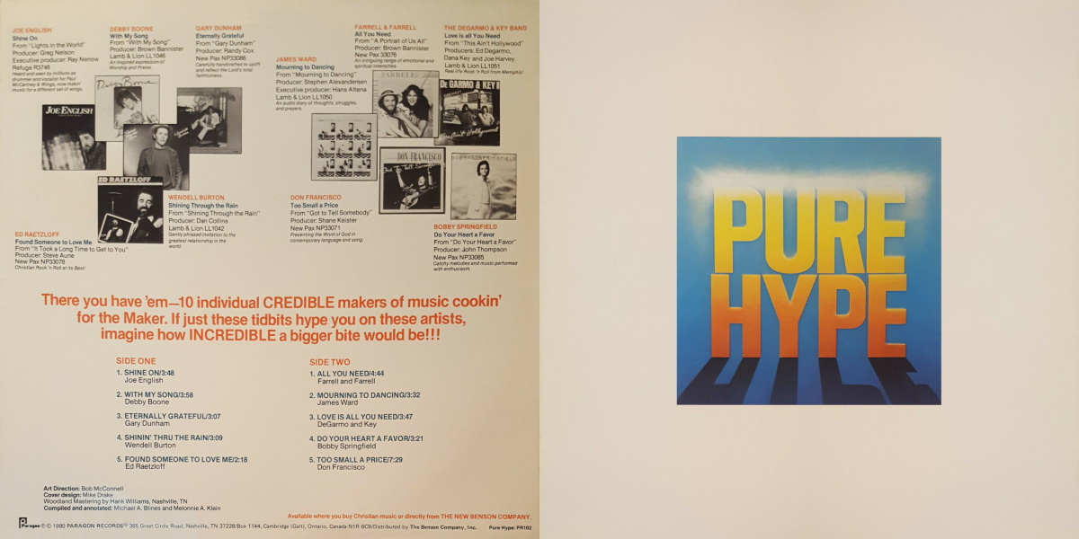 Pure Hype is a multi-artist compilation album released on Paragon Records in 1981, distributed by The Benson Company. The album features one track each from 10 albums released on either NewPax ‎Records, Lamb & Lion Records, or Refuge Records during the last couple of years.