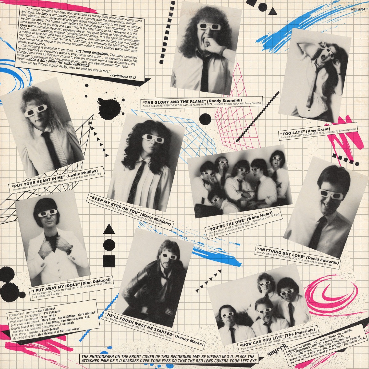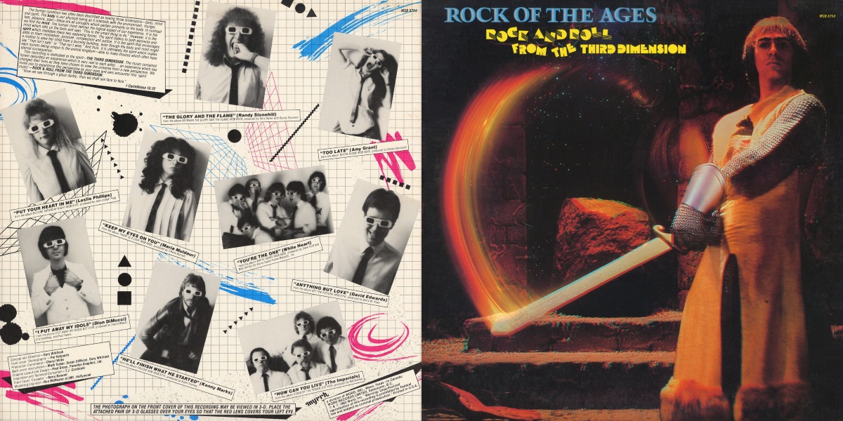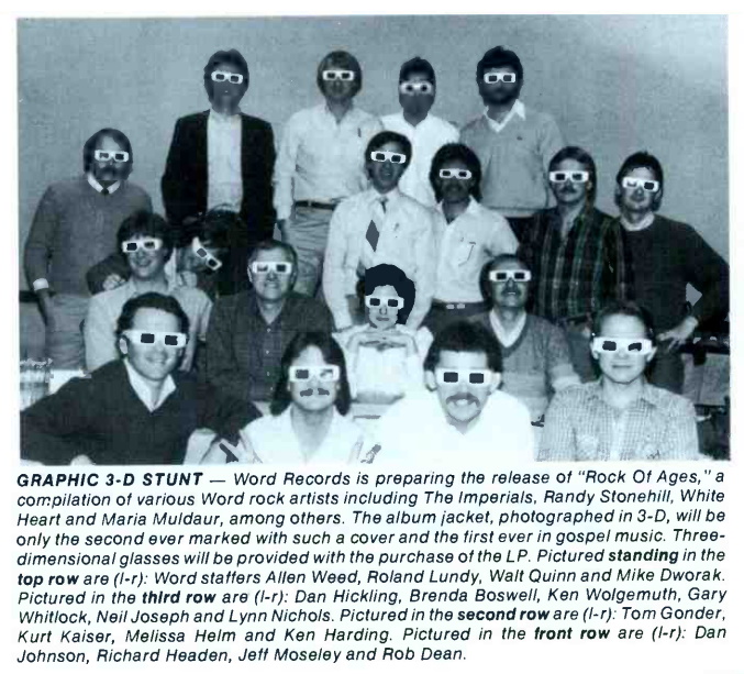 GRAPHIC 3-D STUNT – Word Records is preparing the release of “Rock Of Ages,” a compilation of various Word rock artists including The Imperials, Randy Stonehill, White Heart and Maria Muldaur, among others. The album jacket, photographed in 3-D, will be only the second ever marked with such a cover and the first ever in gospel music. Three-dimensional glasses will be provided with the purchase of the LP. Pictured standing in the top row are (l -r): Word staffers Allen Weed, Roland Lundy, Walt Quinn and Mike Dworak. Pictured in the third row are (l -r): Dan Hickling, Brenda Boswell, Ken Wolgemuth, Gary Whitlock, Neil Joseph and Lynn Nichols. Pictured in the second row are (l -r): Tom Gonder, Kurt Kaiser, Melissa Helm and Ken Harding. Pictured in the front row are (l -r): Dan Johnson, Richard Headen, Jeff Moseley and Rob Dean. (An image and note featured in Cash Box Magazine, April 16, 1983)