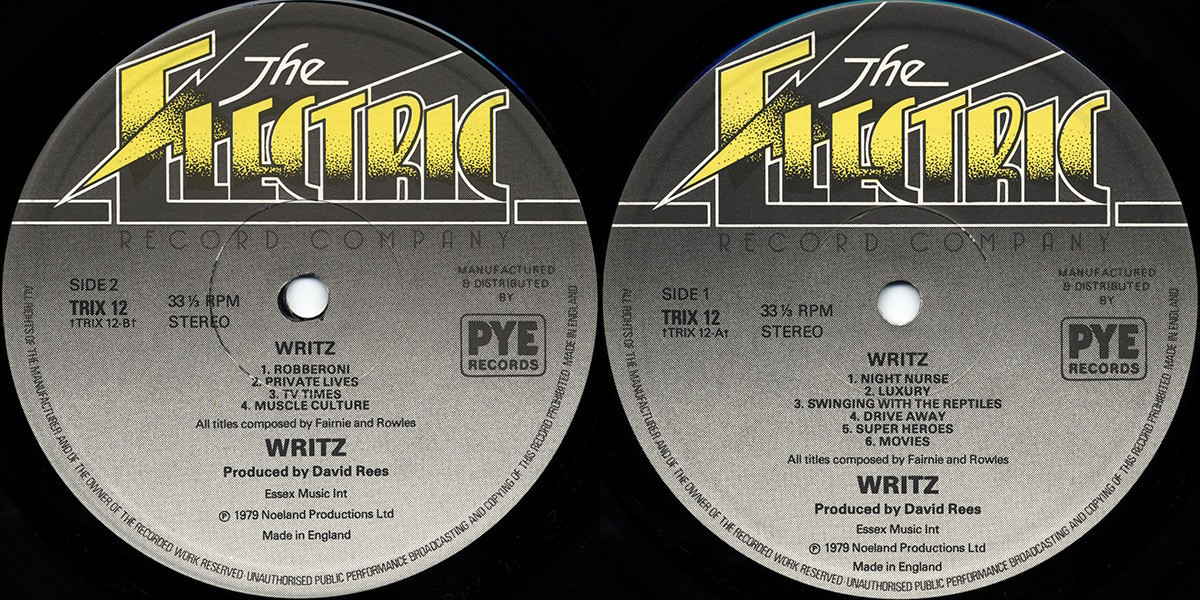 Their self titled debut LP came out in September 79 between the RPM series and the RPM Special. Only two singles were released as Writz: Night Nurse, which almost charted, and the 12″ of which was pressed on transparent green vinyl and came with a fetching white face mask. In France they released a version of Movies. Early in the new year they changed their name to Famous Names, and in June 1980 they went into Trident Studios in London and recorded Holiday Romance / Talk It Out, their only single as Famous Names. An album, Venetian Blind was all but completed before management issues caused the band to fold. The album remains unreleased, though some tracks strayed onto compilations.