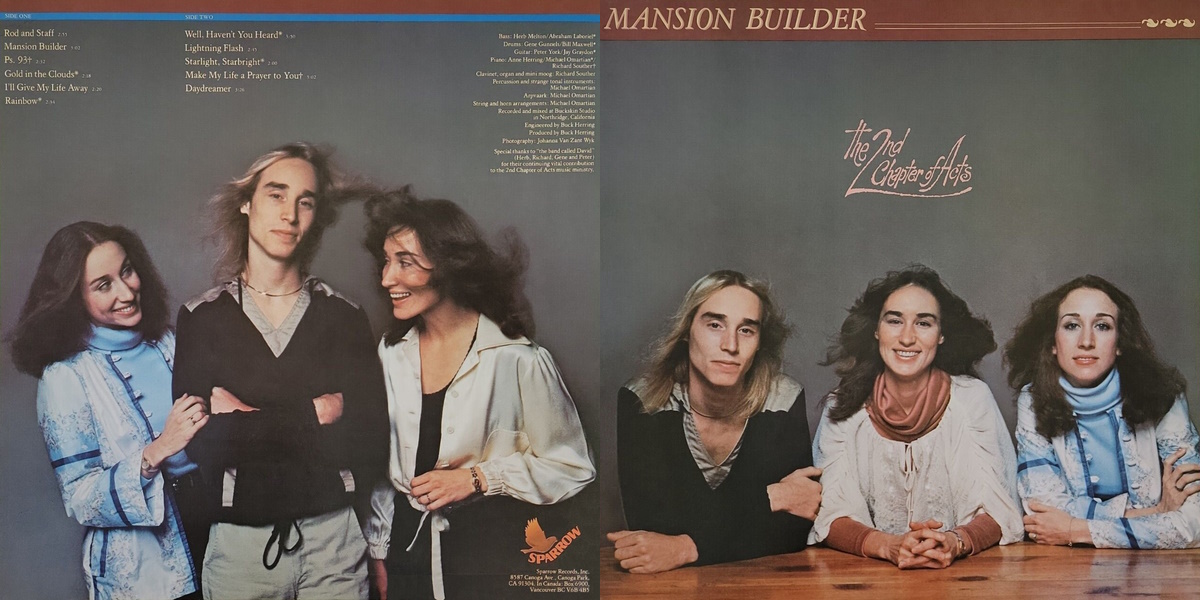 Although they left out hard rock and refined some of the rough edges, Mansion Builder ultimately emerges as another fine album from the threesome. It doesn’t seem to have quite the innocence or energy of their earlier works, plus there’s a lot of string orchestration. Still plenty of strong songs: «Rod And Staff», «Gold In The Clouds», «Well, Haven’t You Heard», «Lightning Flash» and «Starlight, Starbright» to name a few. Includes another Matthew solo in «Psalm 93», again co-written with Richard Souther. Also a cover of Melody Green’s «Make My Life A Prayer To You». Musicianship this time is provided by “a band called David”, the same guys that backed the trio on How The West Was One. Omartian also returns on keyboards and brass/string arrangements. [Ken Scott, The Archivist, 4th edition]