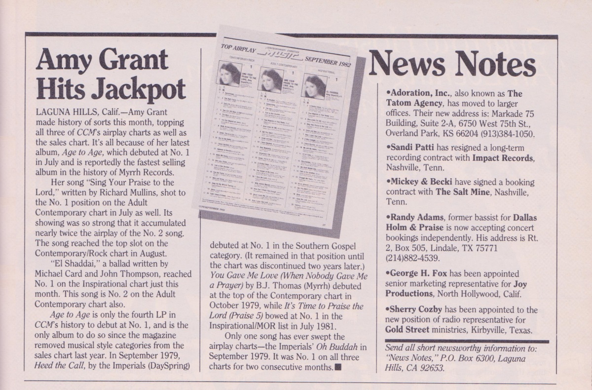 Amy Grant’s Age To Age Hits Jackpot (CCM Magazine, September 1982).