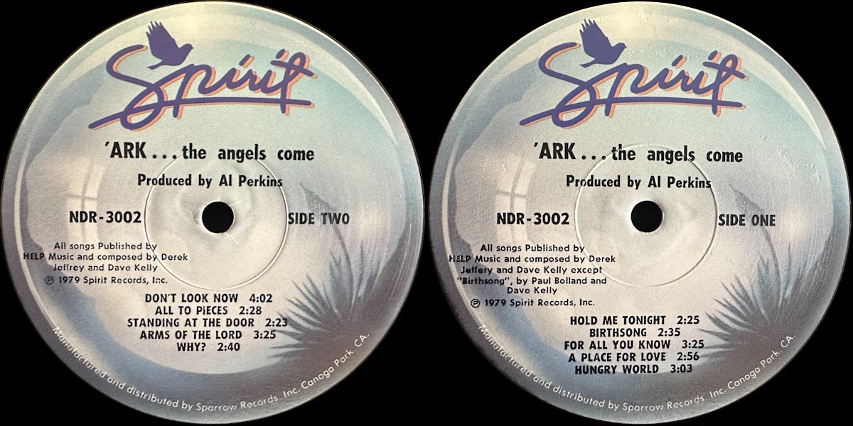 …The Angels Come is the sole album by the British-American pop/rock band ‘Ark, released on Spirit Records in 1979, distributed by Sparrow Records. The album was produced and recorded by band member Al Perkins at the Soundcastle in Hollywood, California. Featuring the two British singers and songwriters Dave Kelly and Derek Jeffery on rhythm guitars and vocals, Al Perkins on lead guitar, and a rhythm section consisting of David MacKay on bass and James Kehn on drums and percussion. All songs co-written by Dave Kelly and Derek Jeffery.