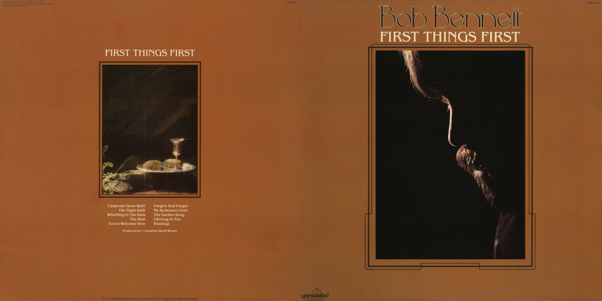 First Things First is the debut album by the American singer and songwriter Bob Bennett, released on Maranatha! Music in 1979. The album was produced, recorded and mixed July to September 1979 by Jonathan David Brown at Maranatha! Studios in Santa Ana, California; with most of the songs recorded almost entirely “live”. All songs written by Bob Bennett except track B4 written by producer Jonathan David Brown and track A4, “The Best”, a song written by John Fowler. (After hearing Bennett’s version of “The Best”, Dion DiMucci chose to cover the song as well, on his 1981-album Only Jesus.) The album also includes Bob Bennett take on the old British hymn, “I Know That My Redeemer Lives”, featuring lyrics written by Samuel Medley in 1775.