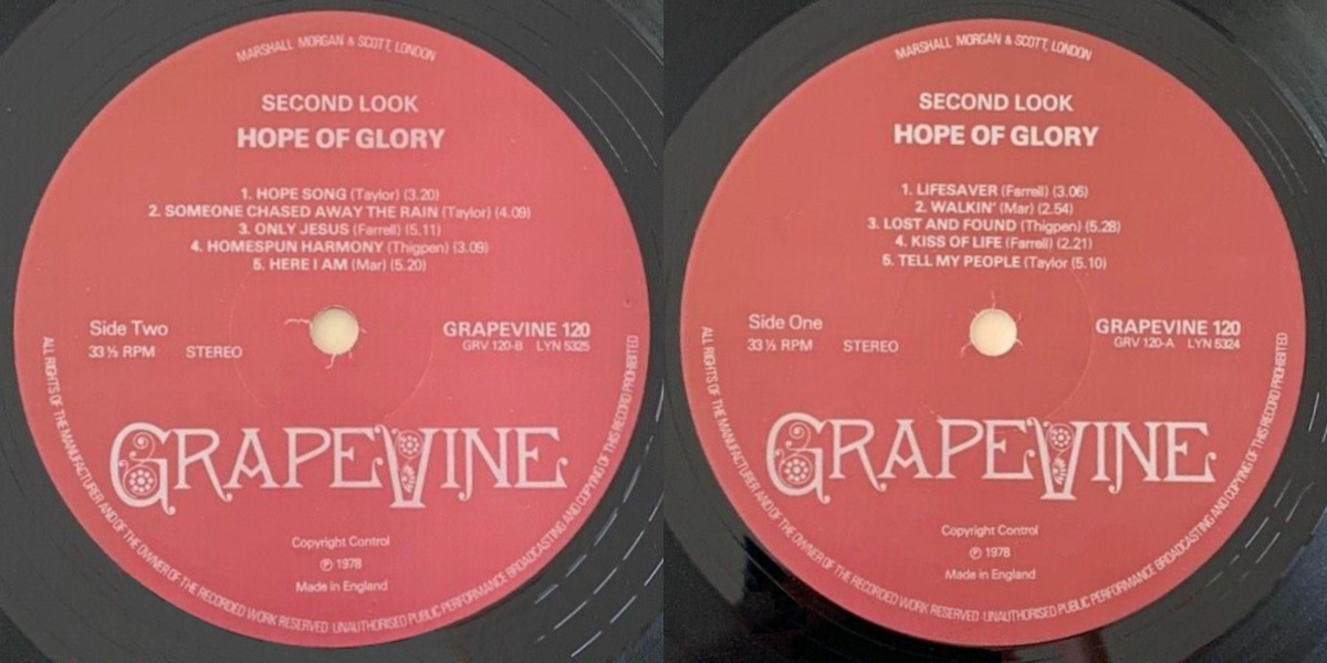 Second Look is the third album by the American pop/rock group Hope of Glory, released on Chrism in 1977, a division of Tempo Records. Also released in the UK on Grapevine the following year. The album was recorded and mixed by Frank Kejmar at Whitney Studios in Glendale, California; with Jesse Peterson producing. Orchestration by Dave Williamson. “Lifesaver”, “Kiss of Life”, and “Only Jesus” were written by Bob Farrell of Farrel & Farrell fame (the first two were as well arranged by Farrell), while “Tell My People”, “Hope Song”, and “Someone Chased Away The Rain” were written by Danny Taylor.