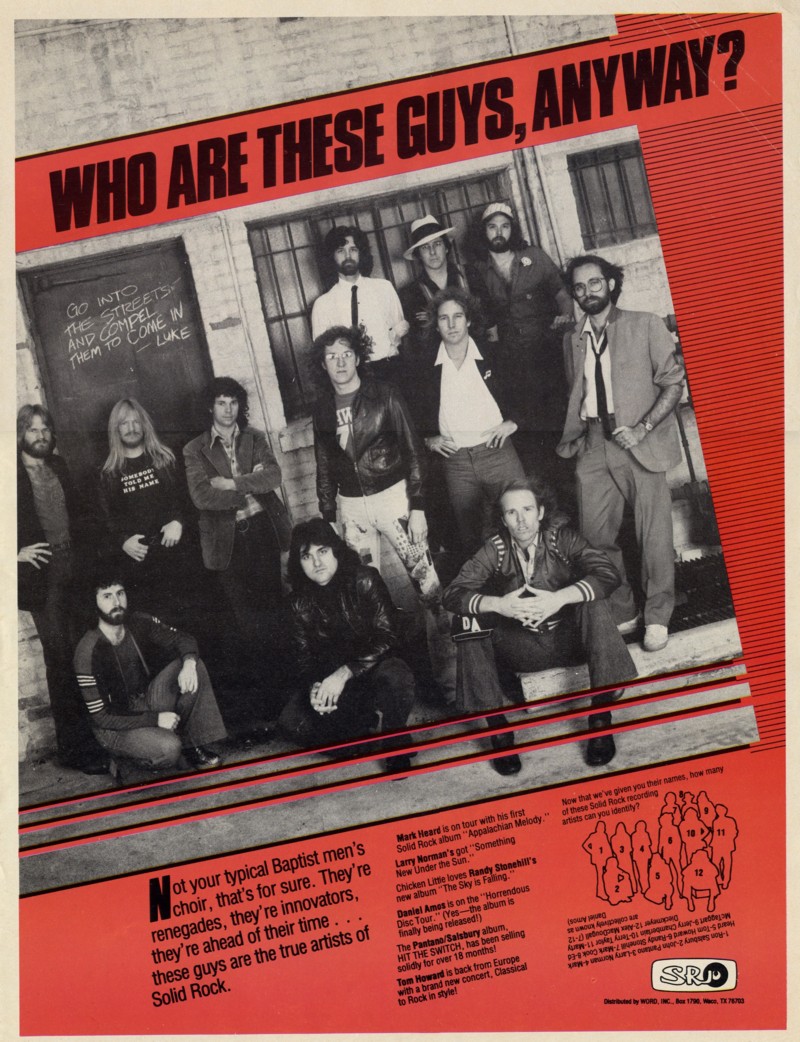 The Solid Rock artist roster, late 70s. A promo ad for the artists signed to Solid Rock Records was featured in the February 1980 issue of CCM Magazine: “Not your typical Baptist men’s choir, that’s for sure. They’re renegades, they’re innovators, they’re ahead of their time … these guys are the true artists of Solid Rock.” The following artists are pictured in the advertisement: 1) Ron Salsbury. 2) John Pantano. [ A duo known as Pantano-Salsbury. ] 3) Larry Norman. 4) Mark Heard. 5) Tom Howard. 6) Randy Stonehill. 7) Mark Cook. 8) Ed McTaggart. 9) Jerry Chamberlain. 10) Terry Taylor. 11) Marty Dieckmeyer. 12) Alex MacDougall. [ 7-12 collectively known as Daniel Amos. ]