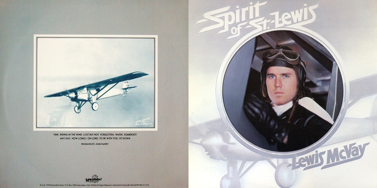 The cover photo and insert for Spirit of Saint Lewis was take at the San Diego Aerospace Museum in 1978. I was prompted to go do the photo shoot for this record before we even started the project, the record company didn’t want to shoot it yet so I just used my own money and got a photographer to come with me so I could do the shoot. Less than a month later the whole place burned to the ground and all was lost, except for my pictures of that plane. It was an exact replica built by the same builders as the original Spirit plane hanging in the Smithsonian. They have rebuilt the Museum and a third replica of the Charles Lindbergh plane but that plane on my record is long gone. [Lewis McVay]