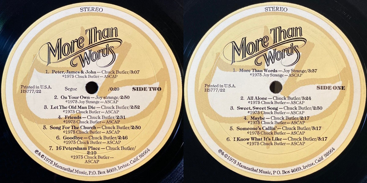 More Than Words is the debut album by the American country-rock/soft-rock band Parable, released on Maranatha! Music in 1975. The album was recorded by Jonathan David Brown and Buddy King at Buddy King Studios in Huntington Beach and Mama Jo’s Recording Studio in North Hollywood, California; with Tommy Coomes of Love Song fame producing. Mixed by Brown at Buddy King Studios. Orchestrated by Jim Stipech. All songs written by Chuck Butler except tracks A1 and B2 written by Joy Strange. The album track “Maybe” was as well included on the Maranatha! Music sampler LP Maranatha! 5 released the same year.