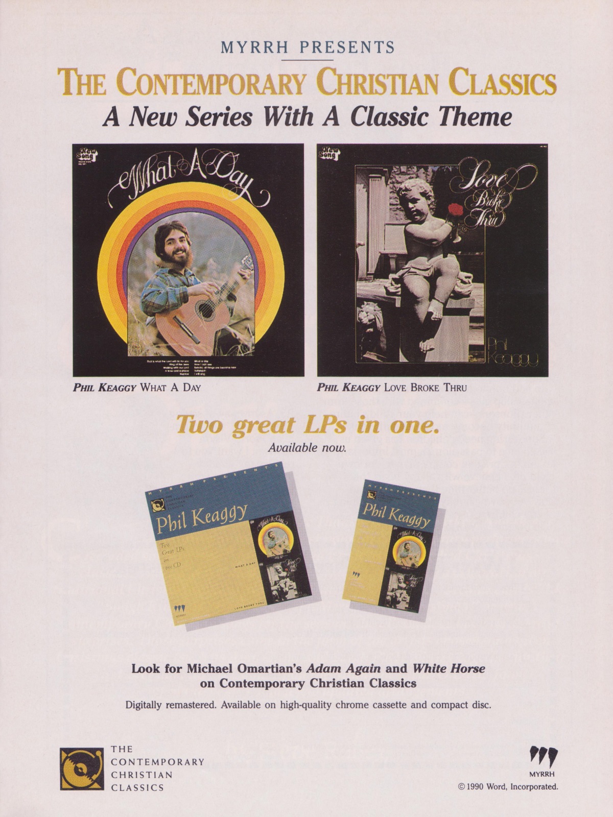 A full-page advertisement for the CD-reissue of the classic Phil Keaggy albums What a Day and Love Broke Thru was featured in the December 1990 issue of CCM Magazine.