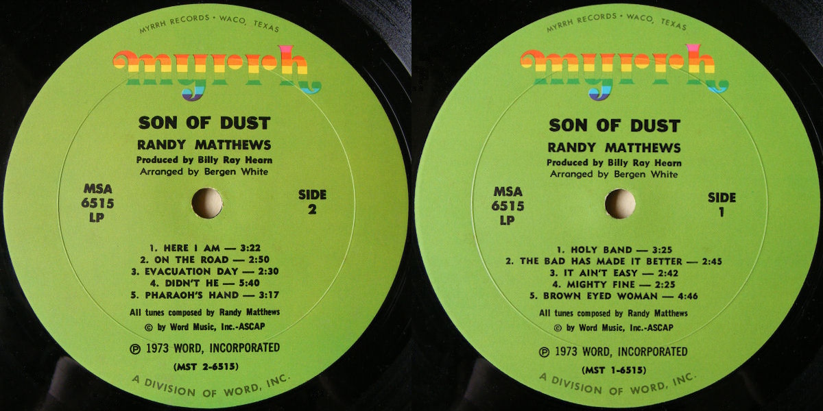 Son of Dust is the third album by the American singer and songwriter Randy Matthews, released on Myrrh Records in 1973, a division of Word. (It was the 15th album released on the Myrrh label.) Also released on Word’s Myrrh Gold label in the UK the following year. The album was recorded at Woodland Studios in Nashville, Tennessee; with Billy Ray Hearn producing. Arranged by D. Bergen White. All songs written by Randy Matthews.