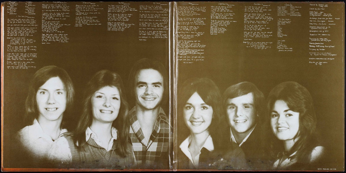 Psalms picked up Kelly Bagley (i.e., Kelly Willard) as a new member and enlisted the services of Sonlight/Koinonia musicians Harlan Rogers (organ) and Hadley Hockensmith (lead guitars). Opens with a pleasant country pop song «A Man Called Jesus», then settles into mega-mellow ballads and CCM for the remainder of the album. «My Friend» and the richly orchestrated ballad «This Christ» are perhaps the closest they came to approximating that MOR style of The Carpenters. Mostly originals written by Jonathan David Brown, along with Harlan Rogers’ «A Psalm Of Love» and Danniebelle Hall’s «Keep Holdin’ On». Gatefold cover. [Ken Scott, The Archivist, 4th edition]