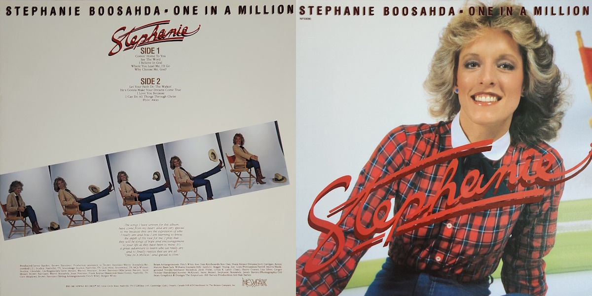 One in a Million is the third album by the American singer and songwriter Stephanie Boosahda, released on Chrism in August 1979, a division of Tempo Records. (Re-issued the following year by NewPax Records featuring new cover artwork and distributed by The Benson Company.) The album was recorded by Steve Messer, Warren Peterson, and Brown Bannister at LSI Studios and Soundstage Studios in Nashville and The Gold Mine in Brentwood, Tennessee, and as well at MCA Whitney Recording Studios in Glendale, California; with Bannister and James Barden producing. Mixed by James Barden, Steve Messer, Brown Bannister, Jesse Peterson, and Frank Kejmar. String arrangements by Fletch Wiley and Bergen White. All songs written or co-written by Stephanie Boosahda.