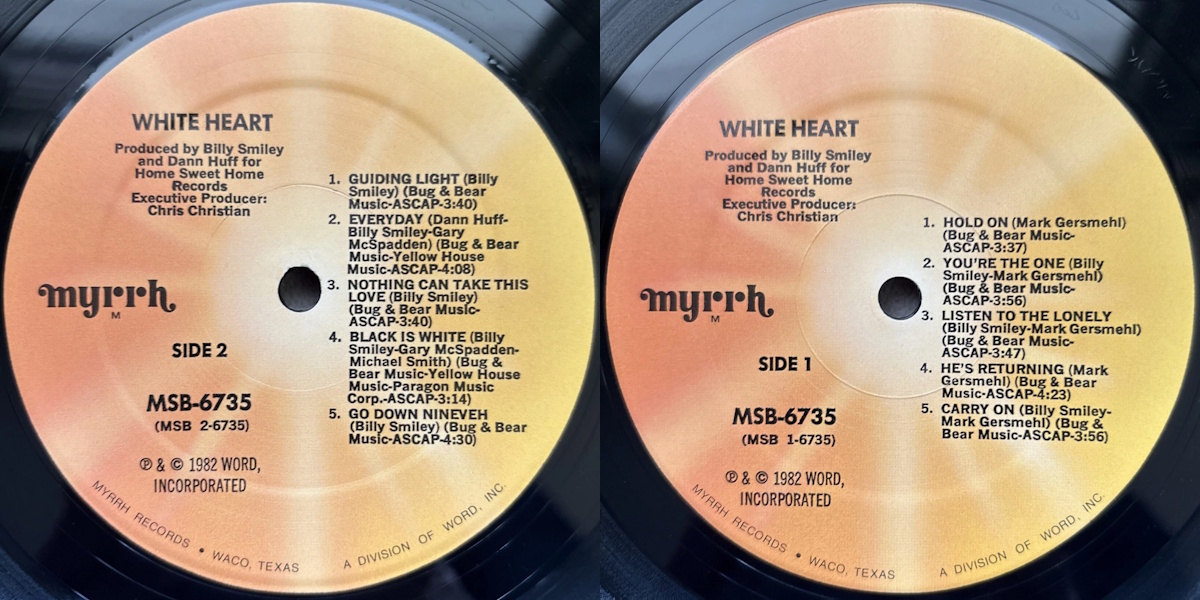 White Heart - White Heart (Home Sweet Home Records 1983) LP labels, Side2 and Side1