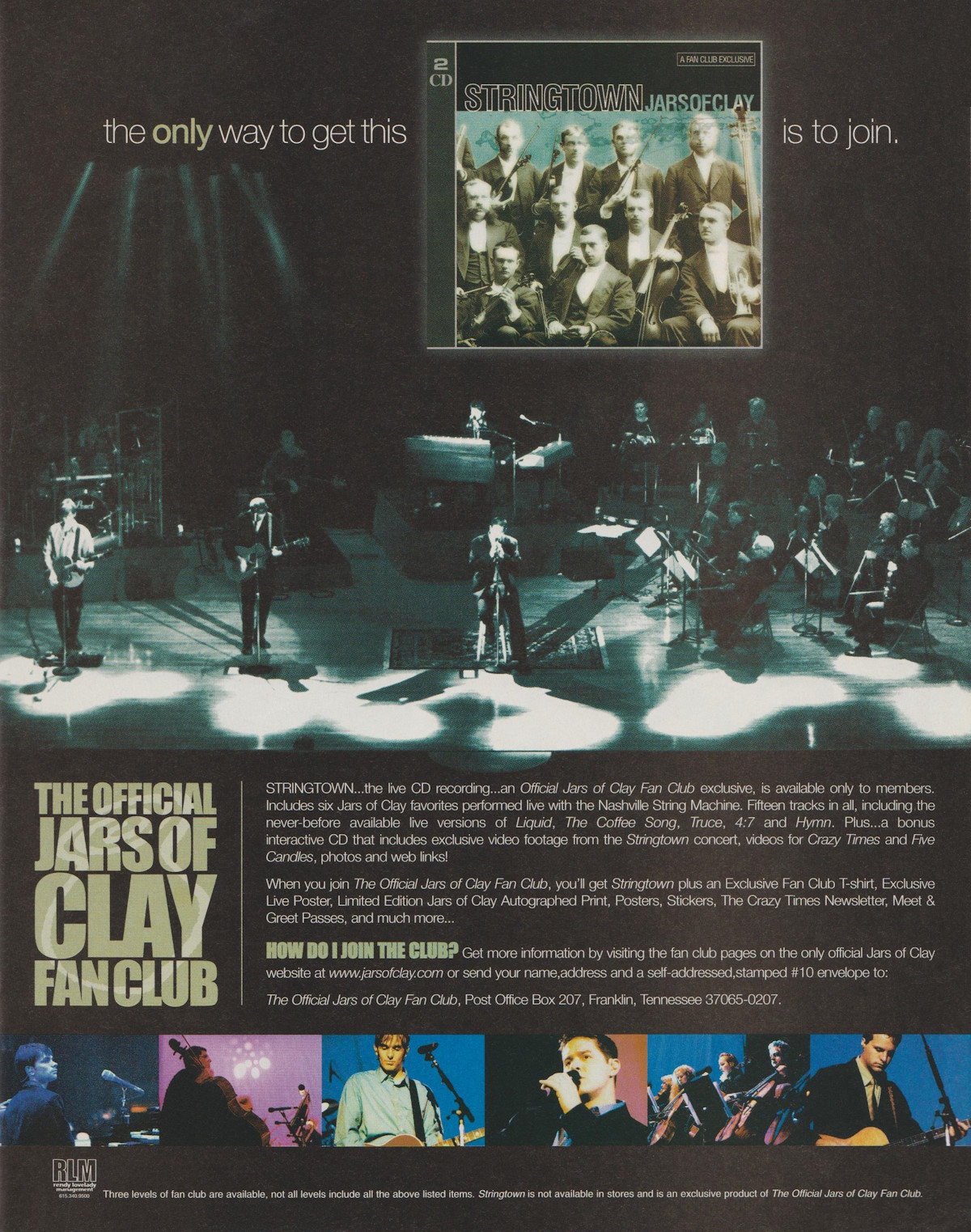 A full-page advertisement for Jars of Clay’s double disc live album Stringtown was featured in the December 1999 issue of CCM Magazine.
