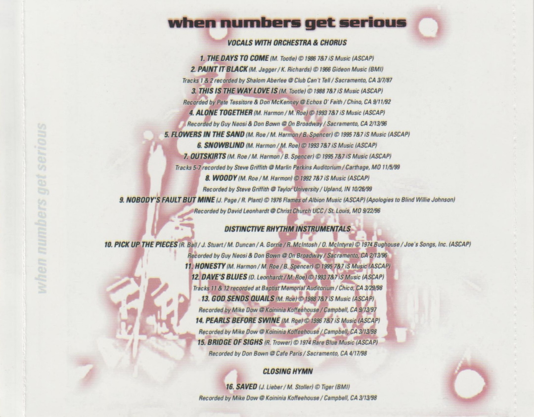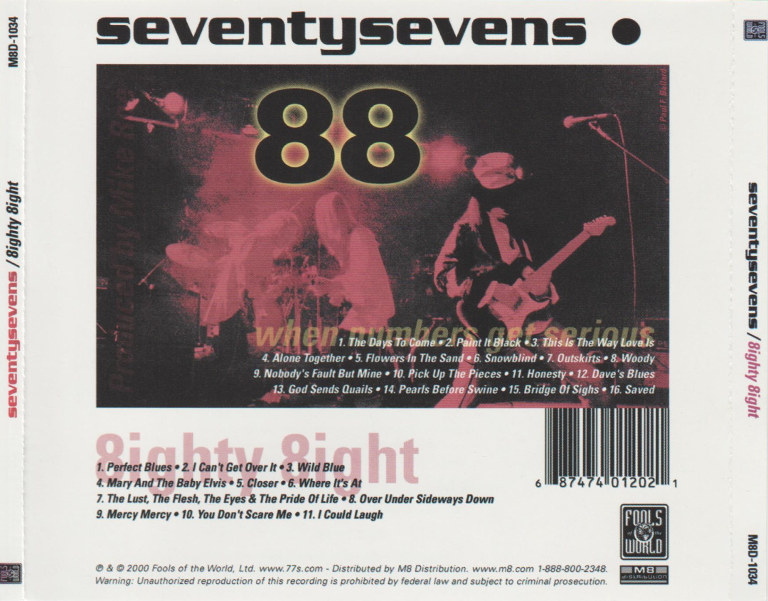 Eighty Eight / When Numbers Get Serious is a double disc live album by the American rock band The Seventy Sevens, independently released on the band’s own label Fools of the World in 2000, distributed by M8 Distribution. Disc one, Eighty Eight, was originally released on Brainstorm Artists International in 1991, manufactured and distributed by Word. The album was recorded live at The Warehouse in Sacramento, California; on March 12, 1988. Recorded by Daryl Zachman with The 77s guitarist Michael Roe producing. Mixed by Steve Griffith of Vector fame. The second disc, entitled When Numbers Get Serious, features live tracks that span the history of the 77’s as a live band with various players.