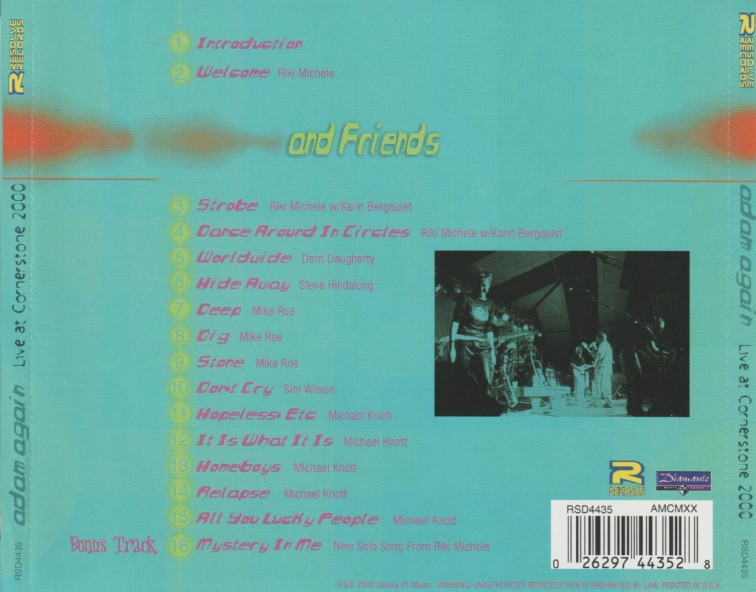 Live at Cornerstone 2000: Their Final Performance – A Tribute to Gene Eugene is a multi-artist 2CD set, released on Resolve Records in 2000, in co-operation with Galaxy 21 Music, distributed by Diamante. Disc One features Adam Again’s last concert, given with friends of Gene Eugene filling the lead vocals after his death earlier in March of 2000. The last track on disc one is a new solo studio track by Adam Again’s Riki Michele from here up-coming solo album, Surround Me. Similarly, Disc Two is a solo studio album by Adam Again guitarist, Greg Lawless. Comes with a sticker that says: “Two CD Set. Over 25 Songs! Disk1: Adam Again Live at Cornerstone featuring members of 77’s, The Choir, Undercover, The Prayer Chain & more. Pluss all new bonus song from Riki Michele. Includes enhanced portion with AA music video and interviews. Disk2; Greg Lawless solo album.”