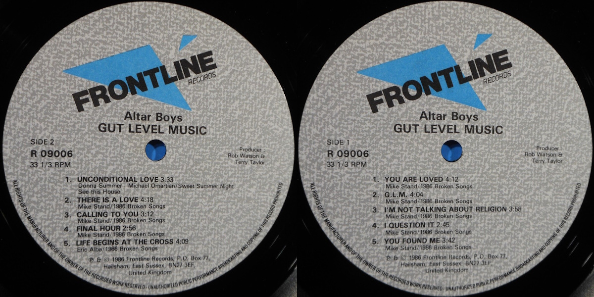 Gut Level Music is the third album by the American alternative rock band Altar Boys, released on Frontline Records in June 1986. The album was recorded and mixed by Rob Watson at 3-D Studios in Costa Mesa, California; with Watson and Terry Taylor of Daniel Amos fame producing. Featuring a cover of “Unconditional Love”, a song co-written by Donna Summer and Michael Omartian and originally featured on Summer’s 1983-album, She Works Hard for the Money.