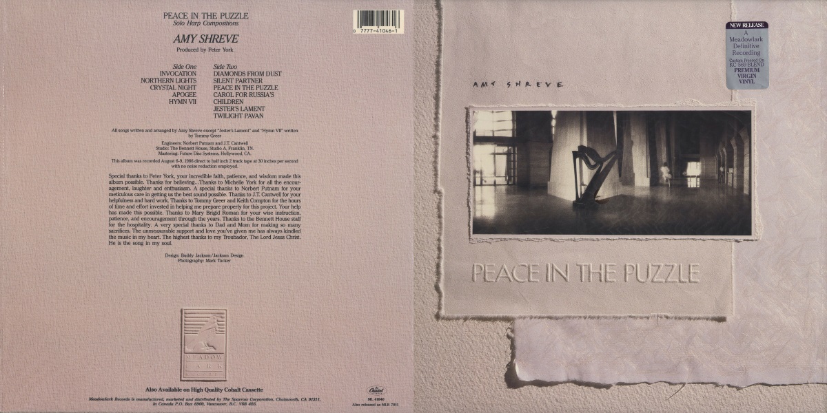 Peace in the Puzzle, sub-titled Solo Harp Compositions, is an instrumental album by the American harpist Amy Shreve, released on Meadowlark Records in 1986, manufactured, marketed and distributed by Sparrow Records. The album was engineered by Norbert Putnam and J.T. Cantwell at The Bennett House in Franklin, Tennessee; with Peter York producing. Recorded August 6-9, 1986 direct to half inch 2 track tape at 30 inches per second with no noise reduction employed. All songs written and arranged by Amy Shreve except “Jester’s Lament and “Hymn VII” written by Tommy Greer. The album was part of the Meadowlark Series, a series of contemplative instrumental albums launched by Sparrow Records in late 1985, sub-titled “Music without words for thoughts without limits” and later ammended to “Music for your personal retreat“.