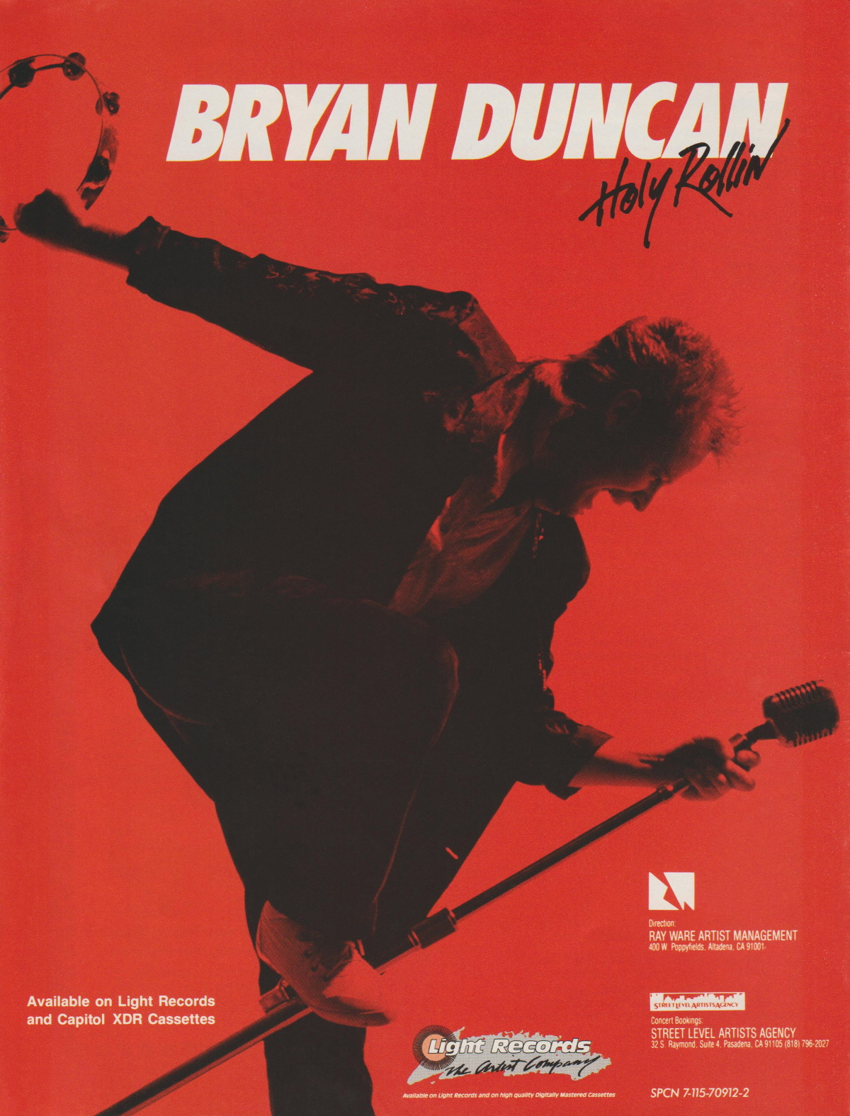 A full-page advertisement for Bryan Duncan’s Holy Rollin’ was featured in the June/July 1986 issue of CCM Magazine.
