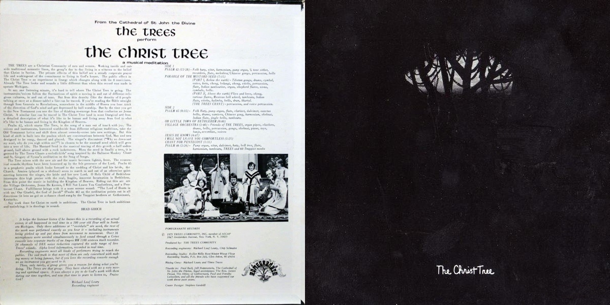 The Christ Tree is an album by the American folk ensemble The Trees Community, released on Pomegranate Records in 1975. The Trees Community were a live-together Christian contemplative group who put their results into music. They were based at the Cathedral Church of St. John the Divine in New York, where they were able to use a kind of rehearsal room that could have 10 to 40 people attending. Their project, “The Christ Tree” was performed during the seventies through a tour in the US and Canada. They created a meditation using musical signatures of many nations and cultures, while using over 80 musical instruments. The musical group varied between 14 and 7 people, with a vast core of 7 members.