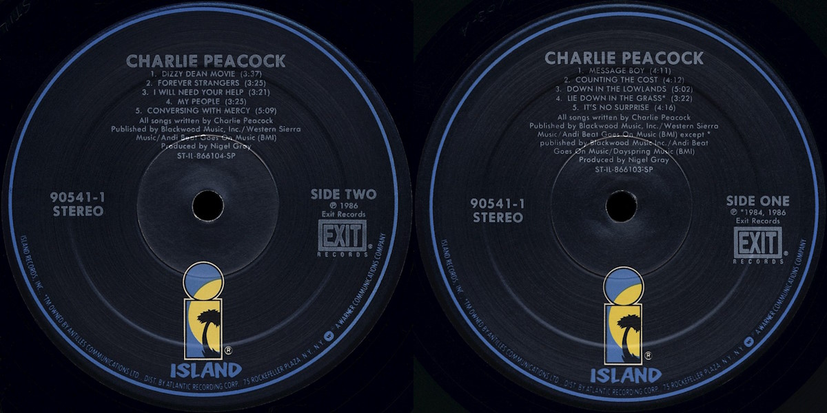 In May 1986 Lou Maglia was hired to head the British based Island Records’ US operation. Later the same year Maglia signed Charlie Peacock to Island Records (along with other Exit acts the 77s and Robert Vaughn and The Shadows), having brought Island Records’ boss Chris Blackwell out to Sacramento, California, the residence of Exit Records, to hear them play. The bulk of the self-titled Charlie Peacock album was originally recorded for A&M Records and initially slated to appear on an album tentatively entitled Town Hall. Though upon hearing the finished master, A&M declined to release it. (“I remember flying to France with my producer Nigel Gray to present the record to the A&M office in Paris. The fellow listened to a few songs then took it off and asked me if I had any songs that used nonsense syllables. He said they really go for that kind of stuff in France…” – CP) Island Records licensed the recording for release, dropped the title, and made various changes in song selection including adding a reworked version of “Lie Down in the Grass” (the title cut from Peacock’s full-length solo debut album). The album track “Down In The Lowlands” was later covered by Russ Taff on his self-titled album released on Myrrh Records in 1987. In 2025, Charlie Peacock released an acoustic version of “Counting The Cost” as a digital single.